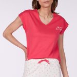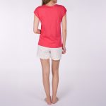 Γυναικεία καλοκαιρινή πυτζάμα Melissa Brown με μοντέρνο και παιχνιδιάρικο σχέδιο. Το σετ αποτελείται από κοντομάνικη μπλούζα σε κόκκινο χρώμα με V λαιμόκοψη και τύπωμα “Ice Day”, καθώς και σορτσάκι σε λευκή βάση με μικρά πολύχρωμα παγωτά. Το σορτσάκι διαθέτει ελαστική μέση με κορδόνι για καλύτερη εφαρμογή και άνεση, προσφέροντας ελευθερία κινήσεων. Το απαλό βαμβακερό ύφασμα χαρίζει δροσερή αίσθηση στο σώμα και είναι ιδανικό για τις ζεστές καλοκαιρινές νύχτες αλλά και για χαλαρές στιγμές μέσα στο σπίτι. Η σύνθεση του είναι 100% Cotton.