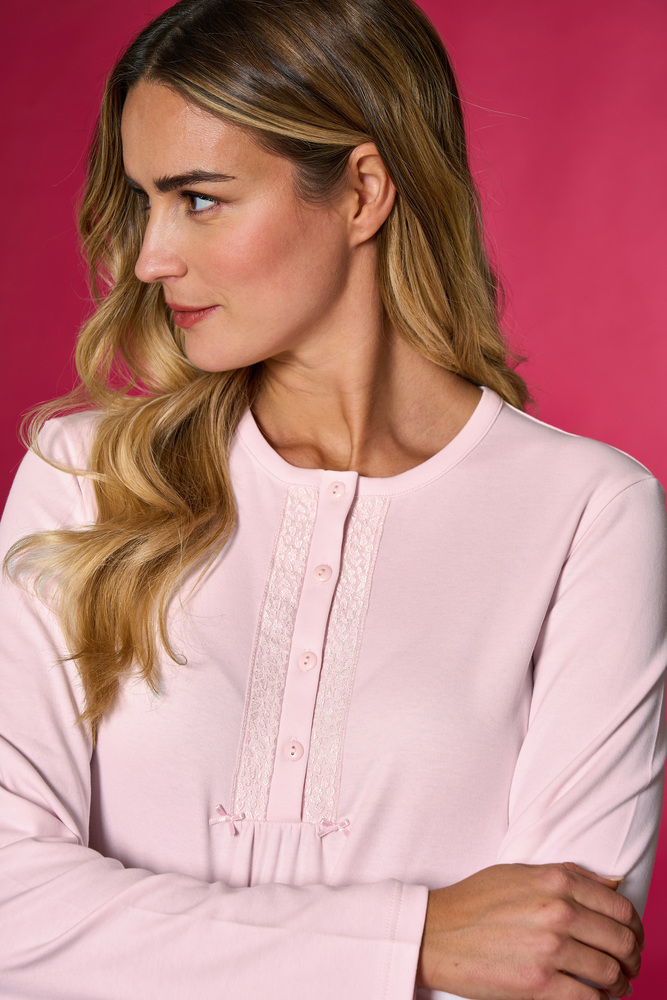 Απαλό γυναικείο νυχτικό LINCLALOR με μακριά μανίκια και κουμπιά στο στήθος. Διαθέτει λεπτομέρεια με διακριτικό μοτίβο γύρω από την πατιλέτα, που χαρίζει ρομαντικό και κομψό ύφος. Κατασκευασμένο από μαλακό βαμβακερό ύφασμα, προσφέρει άνεση και ζεστασιά για χαλαρές στιγμές στο σπίτι. Ιδανικό για τις πιο δροσερές νύχτες. Η σύνθεση του είναι 100% cotton.