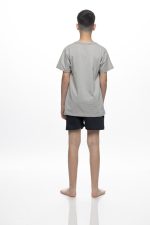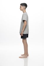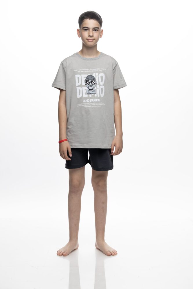 Aγορίστικη  παιδική πιτζάμα Galaxy, ιδανική για άνετο και ξεκούραστο ύπνο αλλά και για χαλαρές στιγμές μέσα στο σπίτι. Το σετ περιλαμβάνει κοντομάνικο t-shirt σε γκρι απόχρωση με μοντέρνο print “DEMIO DEMIO” και βερμούδα σε σκούρο γκρι χρώμα με ελαστική μέση για άψογη εφαρμογή. Η σύνθεση από 100% βαμβάκι εξασφαλίζει απαλότητα και δροσερή αίσθηση στο δέρμα, επιτρέποντας στο σώμα να αναπνέει και να παραμένει άνετο όλη τη διάρκεια της νύχτας. Η σύνθεση του είναι 100% Cotton.