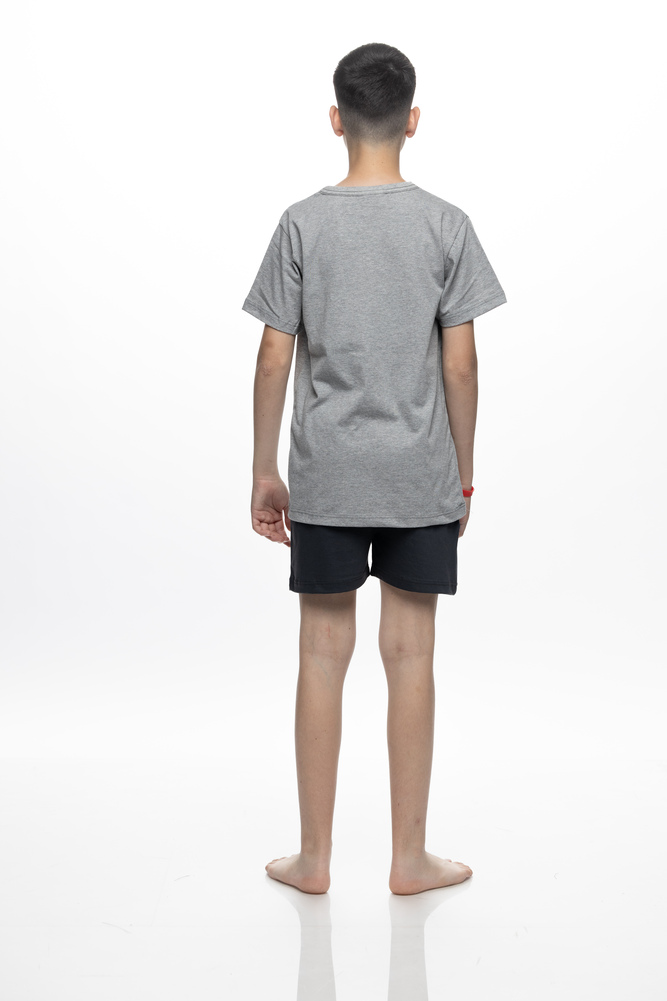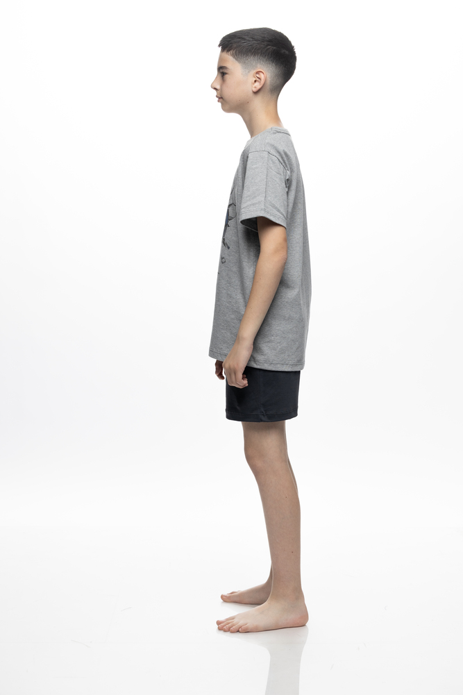 Παιδική πιτζάμα για αγόρι από τη σειρά Galaxy, σε μοντέρνα μελανζέ απόχρωση που συνδυάζει άνεση και παιχνιδιάρικο στυλ. Η μπλούζα διαθέτει εντυπωσιακό τύπωμα με μπάλα και την ένδειξη “A Rising Star”, δίνοντας sporty χαρακτήρα που λατρεύουν τα αγόρια. Το σετ ολοκληρώνεται με μονόχρωμο σορτσάκι με λάστιχο στη μέση για άνετη εφαρμογή και ελευθερία κινήσεων. Κατασκευασμένη από απαλό ύφασμα με υψηλή περιεκτικότητα σε βαμβάκι, είναι ιδανική για καθημερινή χρήση και ξεκούραστο ύπνο. Η σύνθεση του είναι 80% Cotton 20% Polyester.